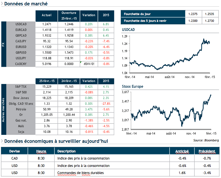 Attendu respectivement à 0.8% et -0.1%, les données sur l’inflation en glissement annuel au Canada et aux États-Unis seront dévoilées ce matin à 8h30. Si on exclut du calcul les coûts de l’énergie et de l’alimentation, l’inflation de base est attendue à 2.1% au Canada et 1.6% aux États-Unis. Une journée potentiellement volatile à l’horizon.