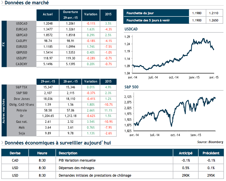 Deuxièmement, comme anticipé, la Réserve fédérale américaine n’a pas annoncé de changement à sa politique monétaire. La faiblesse du PIB du premier trimestre fut considérée, mais les membres de la Fed estiment qu’elle reflète des facteurs passagers et que l’activité économique va croître à un rythme « modéré » cette année. De plus, la banque centrale a complètement abandonné toute indication prospective (« forward guidance »), ce qui implique que ses décisions déprendront uniquement des données. En réaction, le dollar canadien s’est légèrement apprécié face au billet vert, alors que le S&P500 a clôturé en baisse.