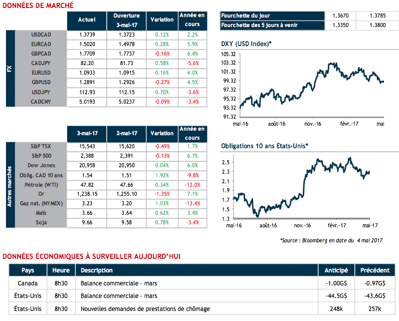 De l’autre côté de l’atlantique, le résultat du débat hier entre les candidats présidentiels Le Pen et Macron place ce dernier vainqueur à 63%. Cette perspective soulage l’euro qui revisite ses récents sommets. Ce matin, le Canada et les États-Unis livrent à 8h30 les données de leur balance commerciale. Ce sera l’occasion pour nous d’observer l’évolution de nos exportations.