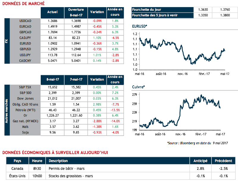 Au niveau économique, nous surveillons aujourd'hui les commentaires de trois membres de la Fed qui prendront respectivement la parole à 9h, 13h et 16h15. Beaucoup de volatilité est donc à prévoir sur le marché obligataire ainsi que sur le dollar américain au cours de la journée. La prochaine rencontre de la Fed se tiendra le 14 juin prochain et le marché des contrats à terme chiffre à 100% les probabilités d'une hausse de taux. La prochaine réunion de la Banque du Canada est prévue le 24 mai prochain.