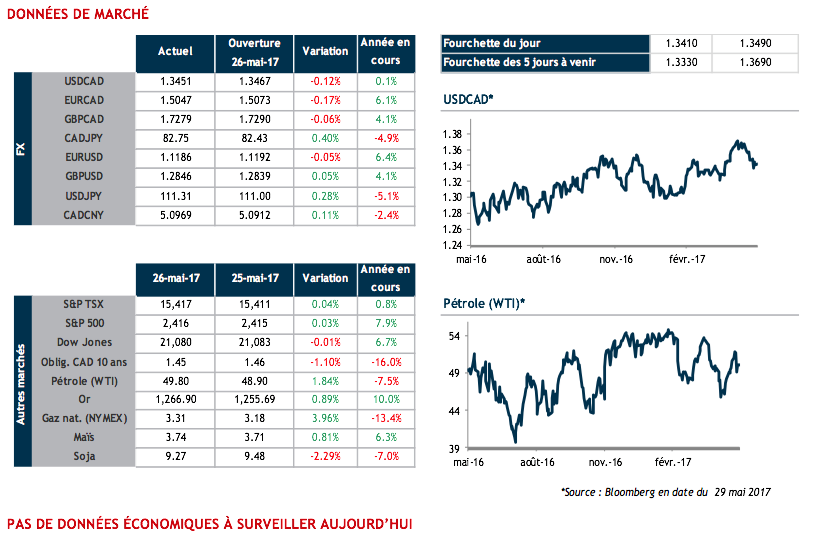 La logique voudrait que les gains du billet vert, présents au niveau des autres devises, finissent par rattraper le huard. Par contre, les marchés américains sont fermés aujourd’hui pour le congé du « Memorial Day », un calme relatif devrait régner sur les marchés.