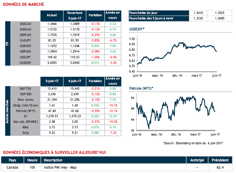 Du côté de nos voisins du sud, les données de la journée d’hier ont démontré un ralentissement de l’activité économique durant le mois dernier. En effet, l’indice ISM non-manufacturier est tombé de 57.5 à 56.9 et les commandes de biens durables et d’usines ont connu une décroissance de 0.8% et 0.2% respectivement. Malgré ces données décevantes, les analystes estiment que la Réserve fédérale maintiendra son cap en haussant son taux directeur ce mois-ci.