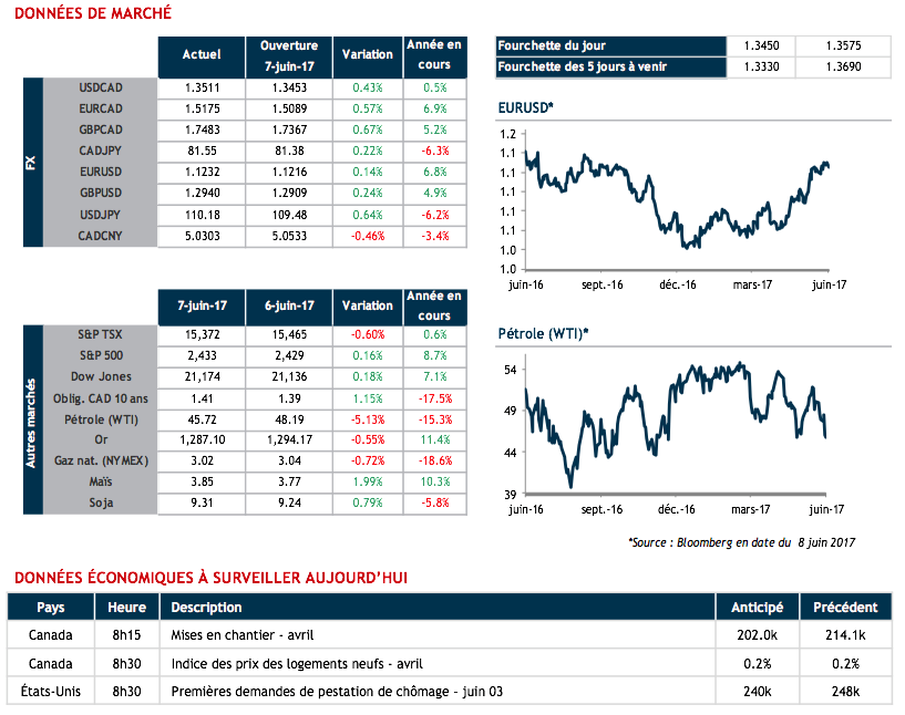 Aujourd’hui, du côté canadien, nous surveillerons les mises en chantier du mois de mai. Du côté américain, nous auront droit aux nouvelles demandes de prestations de chômage et du côté européen, la décision de la BCE et les élections anglaises.