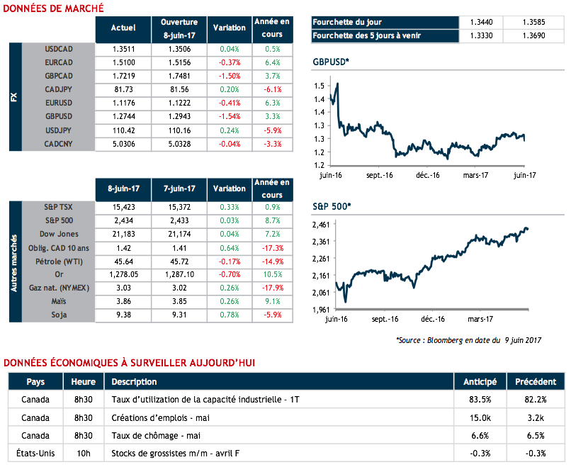 La livre sterling s'est dépréciée de près de 1.5% contre le huard suite aux résultats des élections décevants pour Theresa May. En effet, les conservateurs n'ont pu remporter la majorité, étant à court de 8 sièges parmi les 326 requis. Les négociations pour entamer le Brexit qui sont prévues pour le 19 juin s'annoncent maintenant longues et pénibles.