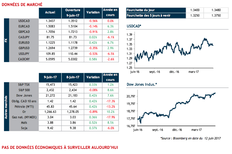 L’économie canadienne continue de montrer des signes positifs : 77 000 emplois à temps plein ont été créés en mai. Nos économistes parlent d’un rapport impressionnant et notent que la hausse des emplois du secteur privé est la plus forte depuis 2 ans. Ils précisent que ce rythme de croissance n’est peut-être pas soutenable mais que ces chiffres sont de bonne augure pour la consommation des ménages. Le ton plus positif de notre banquier central sur l’économie semble avoir été justifié vendredi. Le CAD s’est apprécié de 100 points sur la nouvelle pour finalement terminer à mi-chemin.