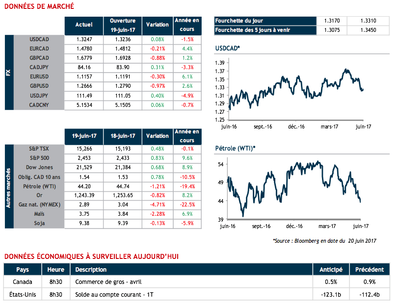 Hier, William Dudley de New York se montrait confiant que la force du marché de l’emploi allait se traduire à plus long terme par une pression à la hausse sur les prix aux États-Unis, poussant le USD légèrement à la hausse et les indices boursiers vers des niveaux records. Toutefois, les commentaires rassurant du Secrétaire américain au commerce Wilbur Ross sur la devise canadienne ont donné de la force à notre dollar, si bien que la paire USDCAD s’est maintenue dans une fourchette serrée toute la journée. Selon lui, le huard devrait reprendre de la force une fois les négociations de l’ALENA terminées et les incertitudes dissipées.