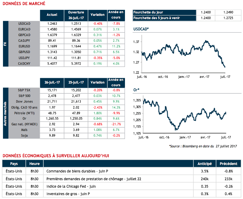 Sans surprise, la Réserve fédérale américaine (Fed) a maintenu le statu quo. Il fut mentionné dans le communiqué que la réduction du bilan commencera ''relativement bientôt'', donc septembre reste la période la plus probable pour le faire selon les attentes du marché. Aussi, il fut souligné que l'inflation persiste sous la cible de 2%, malgré une économie croissante, ce qui signale que la Fed ne sera pas nécessairement pressée d'augmenter les taux d'intérêt. Le dollar américain perdait près de 1 sous contre le huard suite à ces propos tard en après-midi. L'or en est ressorti grand gagnant.