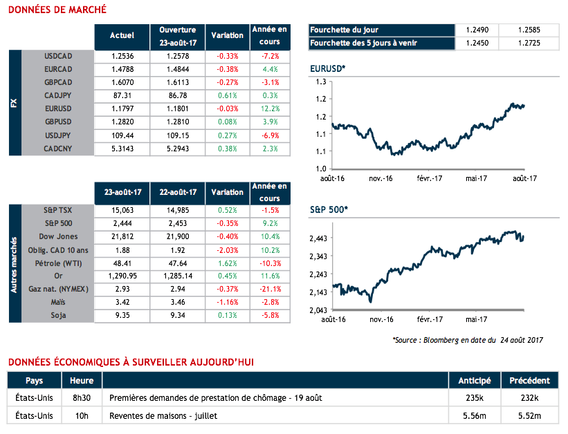 De son côté, le huard n'a pas été trop affecté hier par les commentaires négatifs du président américain sur les négociations de l'accord du libre-échange. Il a plutôt profité de la faiblesse du dollar US et du pétrole brut WTI qui a gagné plus de 1,6% durant la journée. Les inventaires de pétrole aux États-Unis ont baissé pour une huitième semaine consécutive, apaisant ainsi l'excès d'inventaire.