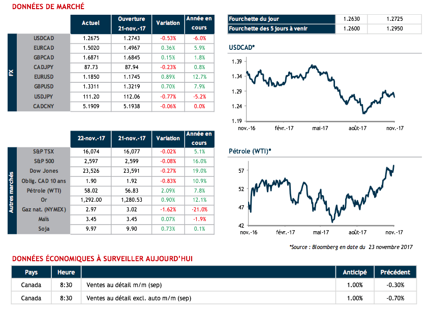 Rappelons que les marchés américains sont fermés aujourd’hui en raison des célébrations de l’Action de grâce. Cela devrait se traduire par une faible volatilité et une liquidité moindre sur le marché des devises. L’euro et le huard enregistrent des gains ce matin alors les marchés boursiers chinois ont connu une séance particulièrement difficile.