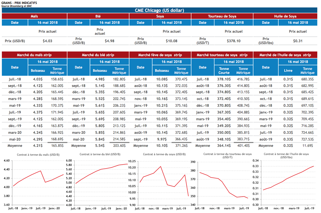 - Le rapport de trituration de soya a établi un nouveau record pour un mois d’avril. Le marché a finalement « crushé » 161 millions de boisseaux de fèves le mois dernier. (au-dessus des anticipations de 160)