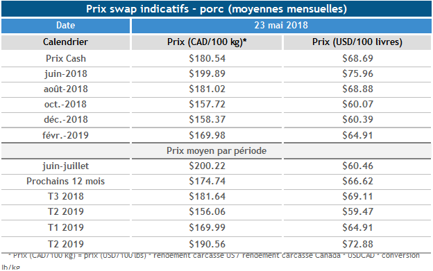 Prix swap indicatifs vendeurs à l’ouverture des marchés - porc (moyennes mensuelles)