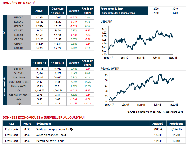 Le huard est en progression ce matin face à l’euro et au billet vert tandis que le pétrole brut (WTI) se maintient près du niveau de 70$ le baril.