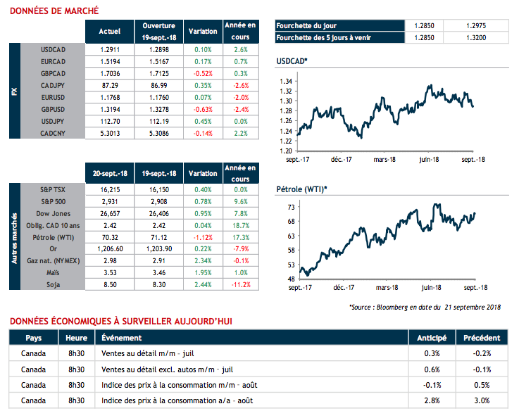 Suite à une excellente semaine, il sera intéressant de constater si le dollar canadien poursuivra sa lancée alors que les investisseurs attendent avec impatience la publication des données d’inflation (IPC) pour le mois d’août dernier au Canada. La dernière lecture à 3% se situait dans le haut de la fourchette de la Banque du Canada (BdC) et à un sommet de près de 7 ans. Un résultat au-dessus des attentes serait favorable au dollar canadien, laissant entrevoir des hausses de taux plus rapides au pays.