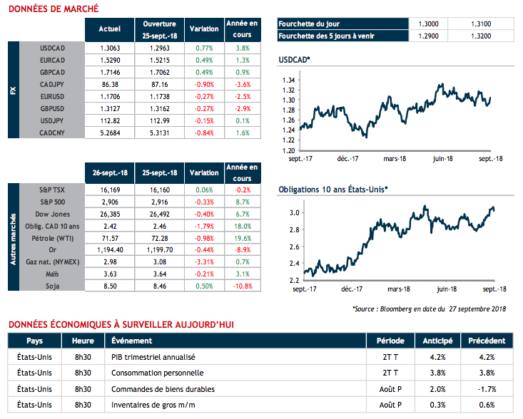 Côté données économiques, surveillons à 8h30 plusieurs résultats américains incluant la lecture finale du PIB du second trimestre, les dépenses de consommation et les commandes de biens durables.