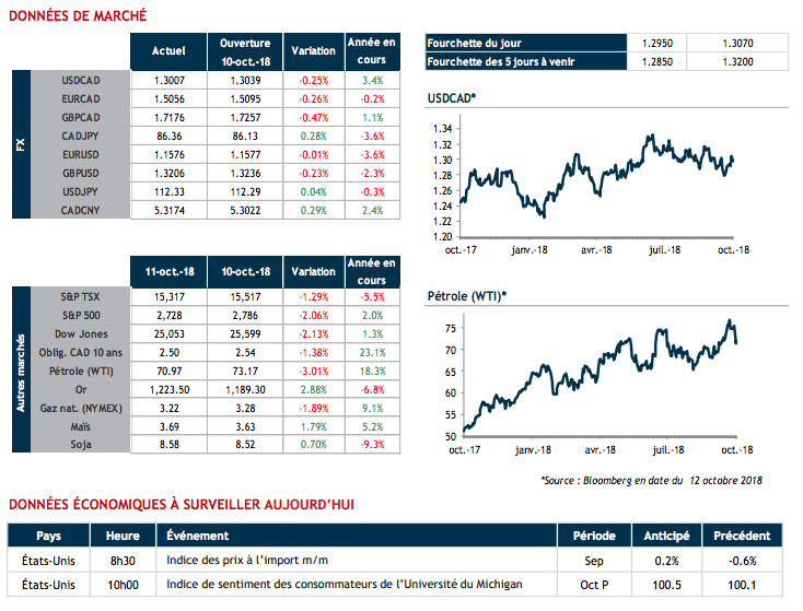 Les marchés boursiers se remettent des lourdes pertes de cette semaine et affichent un léger rebond ce matin. Les résultats corporatifs de plusieurs banques américaines sont attendus et donneront le ton pour la journée. Sur une note positive, la balance commerciale de la Chine en septembre publiée hier soir indique que la guerre tarifaire n’a pas encore affecté leurs exportations. Le huard profite de ce répit sur les marchés pour reprendre du terrain perdu contre le billet vert.