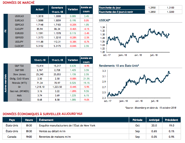 Les 2 premières semaines du mois d’octobre nous ont brutalement rappelé que le marché des devises fonctionne souvent par thèmes. En début de mois, la signature du nouvel ALÉNA avait donné des ailes au CAD qui s’était apprécié de 300 points en 2 jours. Par la suite, l’attention du marché s’est portée sur un autre thème, celui de la hausse des taux d’intérêt aux États-Unis, alimentée par les nombreux discours des membres de la Réserve fédérale. Cette hausse des taux long terme américains a finalement déclenché une forte correction sur les marchés des actions et a affaibli le CAD.