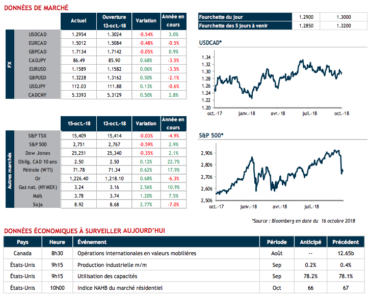 Côté canadien, notre huard a gagné près de 100 points. On parlait hier dans notre commentaire de thèmes très variables, on en a eu la preuve. La publication du sondage de la Banque du Canada (BdC) auprès d’entreprises canadiennes (enquête sur les perspectives d’entreprise – Automne 2018) dépeint une situation plutôt favorable. Voici ce qu’on peut lire sur le site de la BdC : « D’après les résultats de l’enquête de l’automne, les perspectives des entreprises pour le court terme demeurent robustes. La demande vigoureuse et les fortes pressions sur la capacité alimentent les intentions d’investissement et d’embauche ». La saine progression des intentions d’investissement (+33 contre +17 lors du précèdent sondage) est le genre de signal que notre banquier central, M. Poloz, doit aimer lire et qui pourrait rendre son discours du 24 octobre davantage positif. Reparlerait-on alors d’une hausse de taux additionnelle en décembre ?