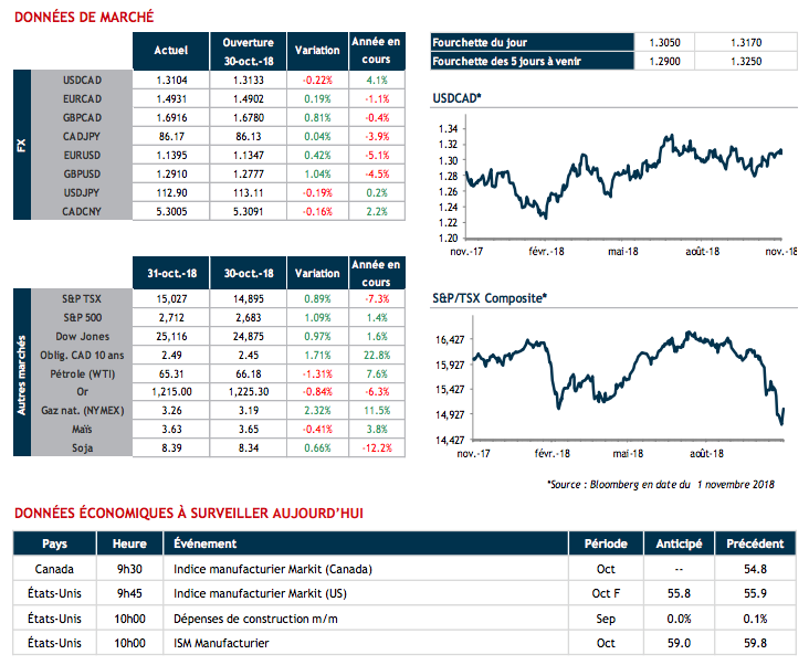 Un rebond des bourses et les données de croissance économique publiées hier au Canada (PIB +2.5% en août, supérieur aux attentes) n’ont pas suffi à soutenir le dollar canadien qui était encore en repli hier face au billet vert.