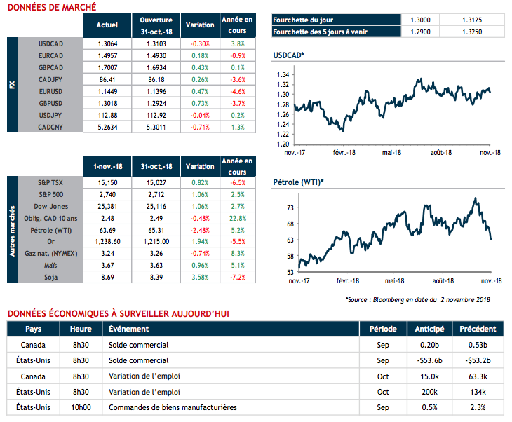 Après un appel téléphonique qualifié de positif avec le président chinois Xi Jiping hier, Donald Trump semble maintenant déterminé à obtenir une entente avec la Chine dans le cadre du sommet du G20 qui se tiendra en Argentine à la fin du mois. Le président américain aurait même demandé à son cabinet de débuter la rédaction d’un éventuel accord. Cette nouvelle est évidemment favorable à la prise de risque. Un rebond des bourses et une impression de « victoire » dans sa guerre commerciale avec la Chine pourraient donner un sérieux coup de pouce aux républicains lors des élections de mi-mandat qui se tiendront en début de semaine prochaine.