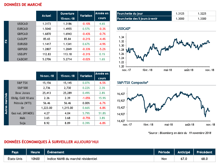 Le calendrier économique au Canada sera chargé cette semaine. La sous-gouverneure de la Banque du Canada, Carolyn Wilkins, donnera une allocution mercredi à Montréal. Nous surveillerons aussi vendredi les ventes au détail pour le mois de septembre et l’inflation en octobre. Le dollar US commence cette semaine de l’Action de grâce avec un léger gain contre le huard.