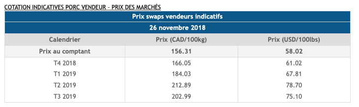 - Recommandation pour les vendeurs de porc : Avec la baisse du dollar canadien sur les marchés et malgré la baisse du porc aujourd’hui, il est encore possible de vendre certaines échéances sur 2019 (Trimestre 1, février, avril et mai 2019).