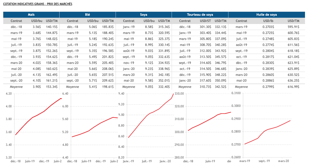 - Les prix des grains sont en baisse suite à la publication des anticipations de récoltes au Brésil (95.3 millions de tonnes de maïs versus USDA à 94.5 alors que le soya est prévu à plus de 122 millions de tonnes)