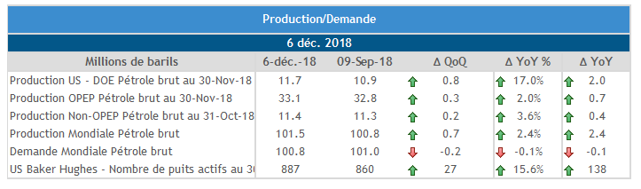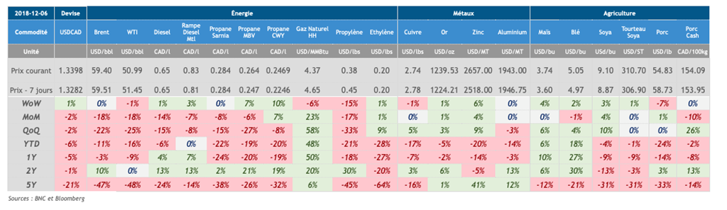 · Le pétrole brut WTI se transige aux alentours de $51.00 USD / barrel en baisse de $1.88 alors que les marchés demeurent secoués par l’arrestation de la Mme Meng. Les négociants pensent que cette arrestation pourrait provoquer un incident diplomatique entre la Chine et les États-Unis et pourrait faire dérailler la bonne entente récente et les signes d’ouverture.