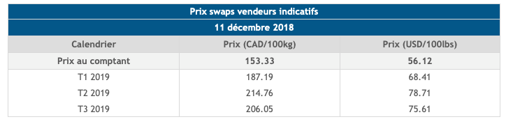 - Après plusieurs jours de hausse, le prix de la découpe a perdu quelques points pour finir la journée à $72.65 USD / 100 livres. Le prix au comptant demeure stable à $56.12 USD / 100 livres.
