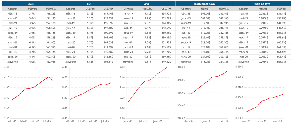 - Le marché des grains anticipent aussi des événements positifs quant aux différends commerciaux qui opposent la Chien et les États-Unis. On ne note aucun problème climatique sur les récoltes en Amérique du Sud.