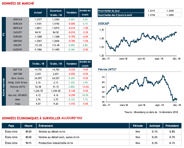 Dans un effort de réduire les tensions avec les États-Unis, la Chine vient tout juste d’annoncer qu’elle allait éliminer les tarifs sur les voitures importées des États-Unis pour une période de trois mois. Nous surveillons ce matin les ventes au détail à 8h30 ainsi que les données sur la production industrielle aux États-Unis à 9h15. Le dollar canadien, le pétrole WTI et les taux obligataires sont en replis ce matin alors que les craintes économiques persistent.