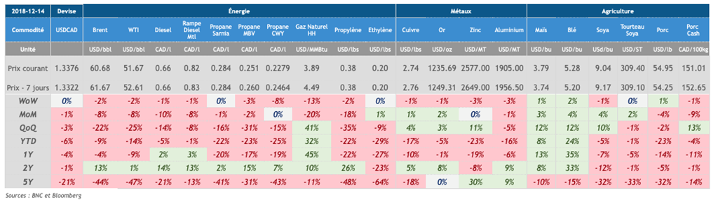 - La Chine vient d’annoncer qu’elle retire ses tarifs sur les importations de voitures américaines pour trois mois. Elle prévoit également reprendre ses importations de maïs aussitôt que janvier. Les données de ventes au détail et la production industrielle américaines sont au-dessus des attentes pour le mois de novembre en croissance de 0.2% versus 0.1% attendu et 0.6% versus 0.3% attendu respectivement. Le dollar canadien a de la misère à reprendre le terrain perdu contre le dollar USD qui se porte bien suite à ces bonnes données.