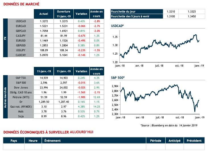 Ce matin, le dollar canadien et les bourses réagissent négativement aux données sur le commerce international en Chine alors que les exportations et les importations ont chuté de 4.4% et 7.6%, respectivement, en décembre.