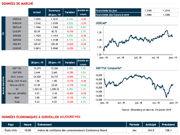 Le ralentissement économique dont on parle depuis plusieurs semaines, notamment en Chine, commence à se faire concrètement sentir. La compagnie Caterpillar a publié des résultats sous les attentes des analystes en mettant en cause la faiblesse de la demande chinoise pour ses machines de construction. Les marchés boursiers ont terminé globalement en baisse et le USD a servi de refuge face au CAD. Apple et eBay annonceront leurs résultats aujourd’hui. Tout ceci en pleine négociation commerciale entre les États-Unis et la Chine qui ont tous les deux intérêt à trouver un accord : la Chine pour ne pas accentuer son ralentissement et l’administration Trump pour stabiliser les marchés dans ce qui ressemble déjà à une campagne électorale pour 2020.