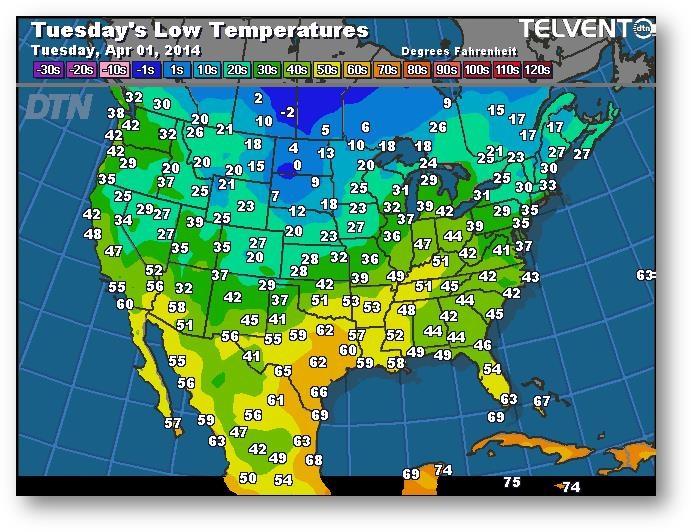 Prévisions des températures les plus basses (degrés Farenheit)