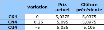 Mardi, les prix du maïs n'ont presque pas bougé alors qu'on a vu une avancée de près de 2% dans le soja et de plus de 3% dans le blé. On s'attend à ce que les prix du maïs demeurent entre 4,75$ et 5,25$ pour les 30 prochains jours.