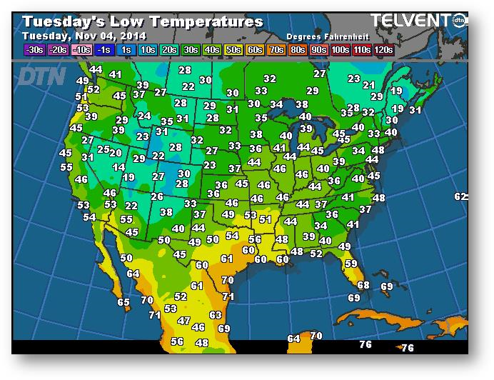 Prévisions des températures les plus basses (degrés Farenheit)