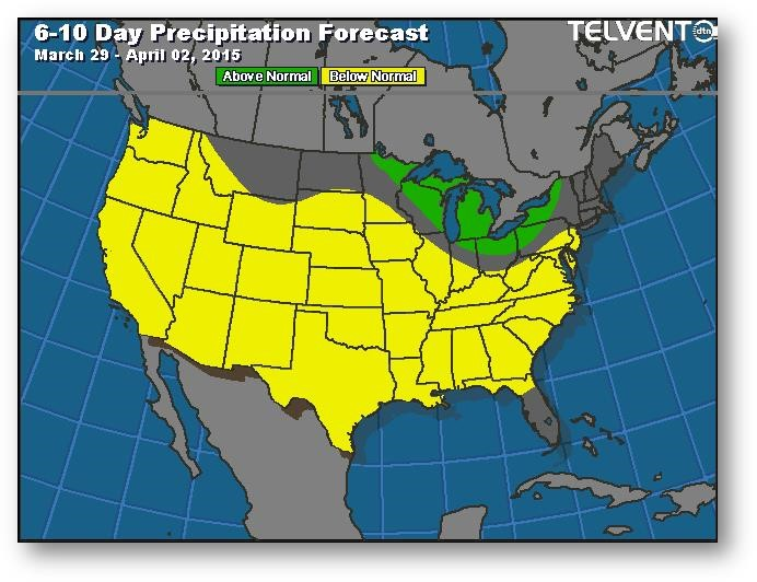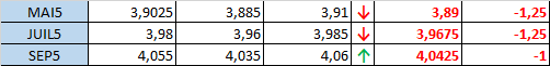 Hier, le redressement des prix suite à la couverture des positions courtes s'est poursuivi hier, mais a ralenti au cours de la nuit et on a vu une baisse de quelques cents. Les exportations ont été de 39,1 millions de boisseaux, ce qui correspond à la moyenne hebdomadaire nécessaire au cours du trimestre (mars-mai). Les marchés au comptant ont profité du redressement hier puisque les agriculteurs ont relativement été de bons vendeurs; ils demeurent attirés par des prix autour de 4$. Les écarts sont toujours extrêmement grands pour cette période de l'année. Seulement quelques états du sud ont publié hier leurs données relatives à l'évolution des semis. La Louisiane avait un résultat de 1% comparativement à 17% il y a un an et à une moyenne de 48%. L'Arizona n'a rien semé alors que 8% était fait l'année dernière et que la moyenne est de 11%. Au Texas, l'ensemencement est avancé à 14%, ce qui est inférieur au résultat il y a un an de 19% et à la moyenne de 28%. On ne s'attend à aucun mouvement majeur d'ici la publication du prochain rapport à moins que le dollar américain ou le pétrole bouge considérablement.