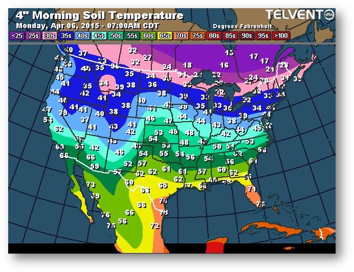 Le marché tente lentement d'instaurer une prime liée aux conditions météo. Les agriculteurs ne sont pas concentrés sur les ventes de leur ancienne ou nouvelle récolte en ce début de travaux dans les champs. Le 10 avril est la date de début de couverture du programme d'assurance récolte pour la majeure partie de la Corn Belt. On ne voit pas de raison qui pourrait pousser les agriculteurs à semer hâtivement vu le risque qui en découle. Jeudi, le USDA mettra à jour ses données sur l'état de l'offre et de la demande; on s'attend à une augmentation des stocks de report de 2014-2015 à 1852-1877 millions de boisseaux.
