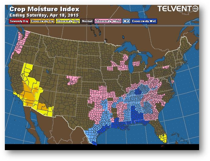 Au cours des derniers jours, les précipitations ont été relativement normales dans la Corn Belt, mais les températures pourraient se mettre à tomber sous la moyenne et ralentir l'ensemencement. L'évaluation de la progression des semis a indiqué une bonne augmentation dans le nord-ouest alors que l'est est légèrement en retard. Les exportations ont été bonnes à 42 millions de boisseaux et supérieures à la moyenne hebdomadaire de 28 millions de boisseaux nécessaire pour atteindre la prévision. L'Argentine a accordé des permis d'exportation pour un autre 3,5 millions de tonnes pour la récolte actuelle, ce qui porte le total à 11,5 millions de tonnes sur la récolte de 24-27 millions de tonnes. Résultats des semis de la semaine dernière pour le delta : Arkansas 66% (moyenne 73%) et Mississippi 71% (moyenne 82%). Pour l'instant, le risque de perdre de la superficie semble concentré en Arkansas, au Mississippi, au Kentucky et au Tenessee. Les intentions d'ensemencement dans ces quatre états en mars étaient d'un total de 3,4 millions d'acres. En raison des prévisions de pluie dans la région cette semaine, il est raisonnable de s'attendre à une perte d'environ 10%.