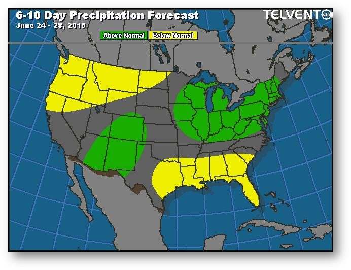 Les préoccupations relatives à la météo à court terme sont compensées par les prévisions de temps plus sec à long terme, l'importance des stocks non vendus par les agriculteurs dans la Corn Belt et le bon départ connu dans les régions qui ne sont pas trop touchées par les précipitations. La tempête tropicale Bill se concentre sur le sud du Missouri, de l'Arkansas et de l'Illinois. Si la tempête continue de se diriger vers le sud, on peut s'attendre à ce que les semis avancent dans le nord du Missouri. Les températures sont normales à sous la normale, ce qui se traduit normalement par un rendement considérable, mais la perte d'azote en raison des fortes précipitations et du temps chaud/sec dans le sud-est pourrait limiter le potentiel moyen dans l'ensemble des États-Unis.