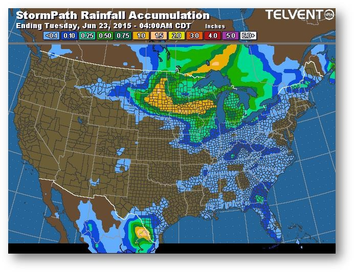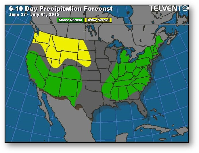 Le rapport mensuel "Cattle On Feed" du USDA a indiqué un résultat de 101% pour le boeuf en parc d'engraissement en date du 1er juin, ce qui correspondait aux attentes. Les placements en mai représentaient 90% du total d'il y a un an et les commercialisations sont à 92%. Le rapport "Hog and Pig" sera publié vendredi prochain. Le marché s'attend à un inventaire de 108% en date du 1er juin. Ce soir, l'évaluation de l'état des cultures devrait indiquer un léger recul en raison d'une baisse des cotes au Missouri, en Illinois et dans l'est de la Corn Belt à la suite des pluies excessives; l'amélioration des cotes dans l'ouest de la Corn Belt ne vient que compenser une partie du recul. On prévoit encore des précipitations cette semaine. Il faudra surveiller les prévisions pour la semaine prochaine et jusqu'à la mi-juillet.