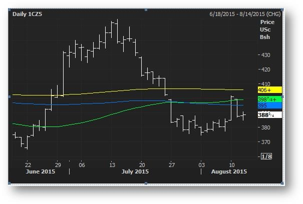 La volatilité dans les contrats de maïs de septembre demeure très élevée. Le contrat de décembre 2015 demeure sous le niveau de résistance majeure; les moyennes mobiles à 20, 50, 100 et 200 jours se trouvent tous à l'intérieur d'une fourchette de 0,11$ entre 3,95$ et 4,06$.