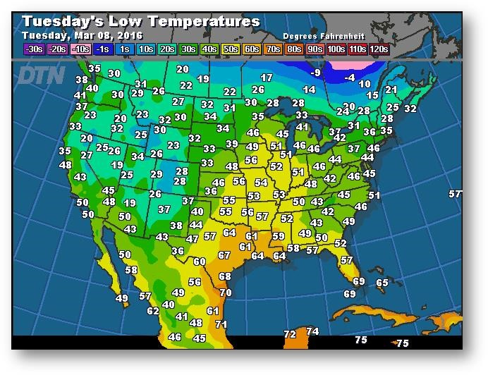 Prévisions des températures les plus basses (degrés Farenheit)
