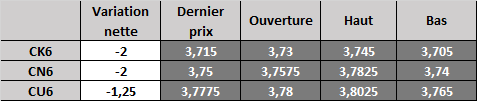 Au cours de la nuit, les prix se sont affaiblis alors qu'hier ils avaient grimpé en flèche, profitant de la force dans le soja et des inquiétudes relatives à la sécheresse dans les régions produisant la safrinha au Brésil. Les fonds auraient acheté entre 30 000 et 35 000 contrats de maïs hier. Les contrats à terme auraient poursuivi leur ascension si ce n'avait été de l'activité des producteurs américains. La production d'éthanol pour la semaine se terminant le 8 avril était de 938 000 barils/jour comparativement à 976 000 la semaine précédente (+1,5% par rapport à l'an passé). La production devrait être de plus en plus basse en avril en raison des mises hors service saisonnières. Les stocks d'éthanol ont augmenté. Aujourd'hui, on s'attend à des ventes à l'exportation entre 900 000 et 1 100 000 tonnes. La moyenne hebdomadaire nécessaire pour atteindre la prévision du USDA est de 424 000 tonnes. Les fonds détenaient une importante position nette courte, mais les positions ouvertes se multiplient sur la hausse, ce qui laisse supposer qu'il ne s'agit pas seulement de couvertures de positions, mais que les fonds veulent se diriger vers une position nette longue dans le maïs. Il s'agit d'un développement qui pourrait pousser davantage le marché vers le haut. Le prochain niveau de résistance majeur se situe à la moyenne mobile à 200 jours à 3,8675$ pour CK6 et 3,965$ pour CZ6.
