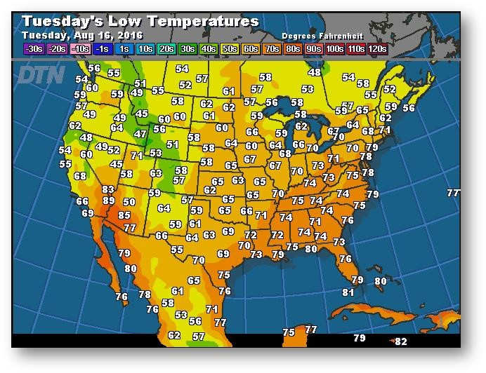 Au cours de la nuit, les prix se sont raffermis sur la poursuite des achats après la clôture élevée vendredi. Évidemment, tout le marché ne parle que du rapport du USDA sur l'état de l'offre et de la demande et de la prévision record d'un rendement de 175,1 boisseaux/acre, ce qui était bien supérieur aux attentes de 170,6 bpa. La production totale pour 2016-2017 est donc évaluée à un record de 15,153 millions de boisseaux et les stocks de report sont estimés à 2,409 milliards de boisseaux. Du côté de la demande, l'alimentation a été revue à la hausse de 175 millions de boisseaux et les exportations de 125 millions de boisseaux, mais ça n'a pas été suffisant pour compenser l'effet de la révision du rendement. Les chiffres sont donc négatifs et les prix ont d'abord fléchi, mais sont finalement remontés aux niveaux précédant la publication du rapport. Des stocks de fin d'année près de 2,5 milliards de boisseaux et un rapport stocks/utilisation à 16,6% indiquerait une chute sous 3$ et peut-être un test de 2,50$, mais le marché ne semble pas prêt à croire à la possibilité d'un rendement de 175 bo/acre. Nombreux sont ceux qui croient que cela aura été la plus importante évaluation publiée. Vendredi, le rapport COT a également été publié; on y indique que les fonds continuent de renforcer leur position nette courte. Les fonds gérés détenaient une position nette courte de 141 000 contrats en date du mardi 9 août, soit une augmentation de 34 000 contrats par rapport à la semaine précédente. Les prévisions météo continuent d'être favorables. Sur un horizon de 8-14 jours, les températures devraient refroidir et le temps être moins sec.