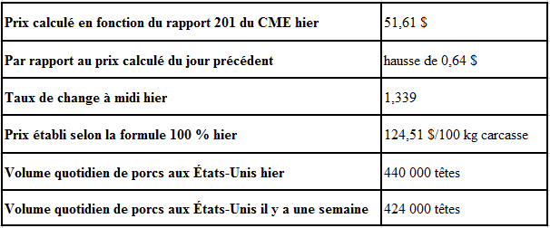 Évolution du prix des porcs castrés et des jeunes truies selon le National Daily Direct Afternoon Hog Report d’hier : baisse prévue de 0,45$ par rapport à la clôture précédente