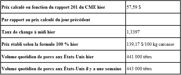 Évolution du prix des porcs castrés et des jeunes truies selon le National Daily Direct Afternoon Hog Report d’hier : baisse prévue de 0,47$ par rapport à la clôture précédente