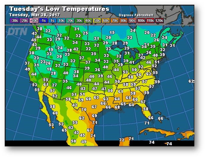 Prévisions des températures les plus basses (degrés Farenheit)