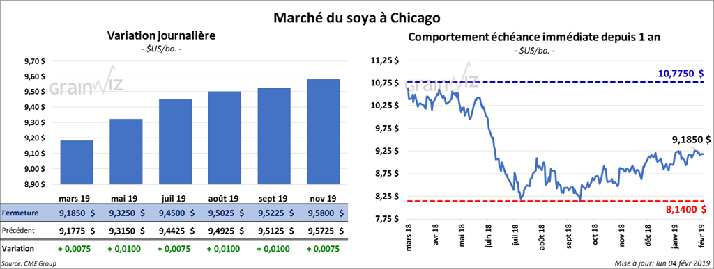 Les contrats de soya à Chicago ont fini la journée en hausse d’une fraction à 1 cent. Les contrats de tourteau ont terminé en recul de 1,20 $/tonne. L’huile a gagné 24 points.