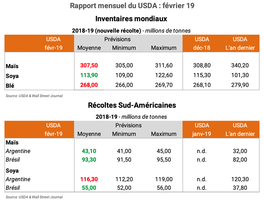 - Bien entendu, avec plusieurs inconnus, il sera intéressant de surveiller les stocks américains de grains. Plusieurs surprises restent possibles en raison des nombreux inconnus qui seront ajustés du côté de l'offre et de la demande. Dans l'ensemble, on retient que dans l'immédiat, on s'attend à des réductions des stocks américains de maïs et soya, mais une hausse de ceux de blé.
